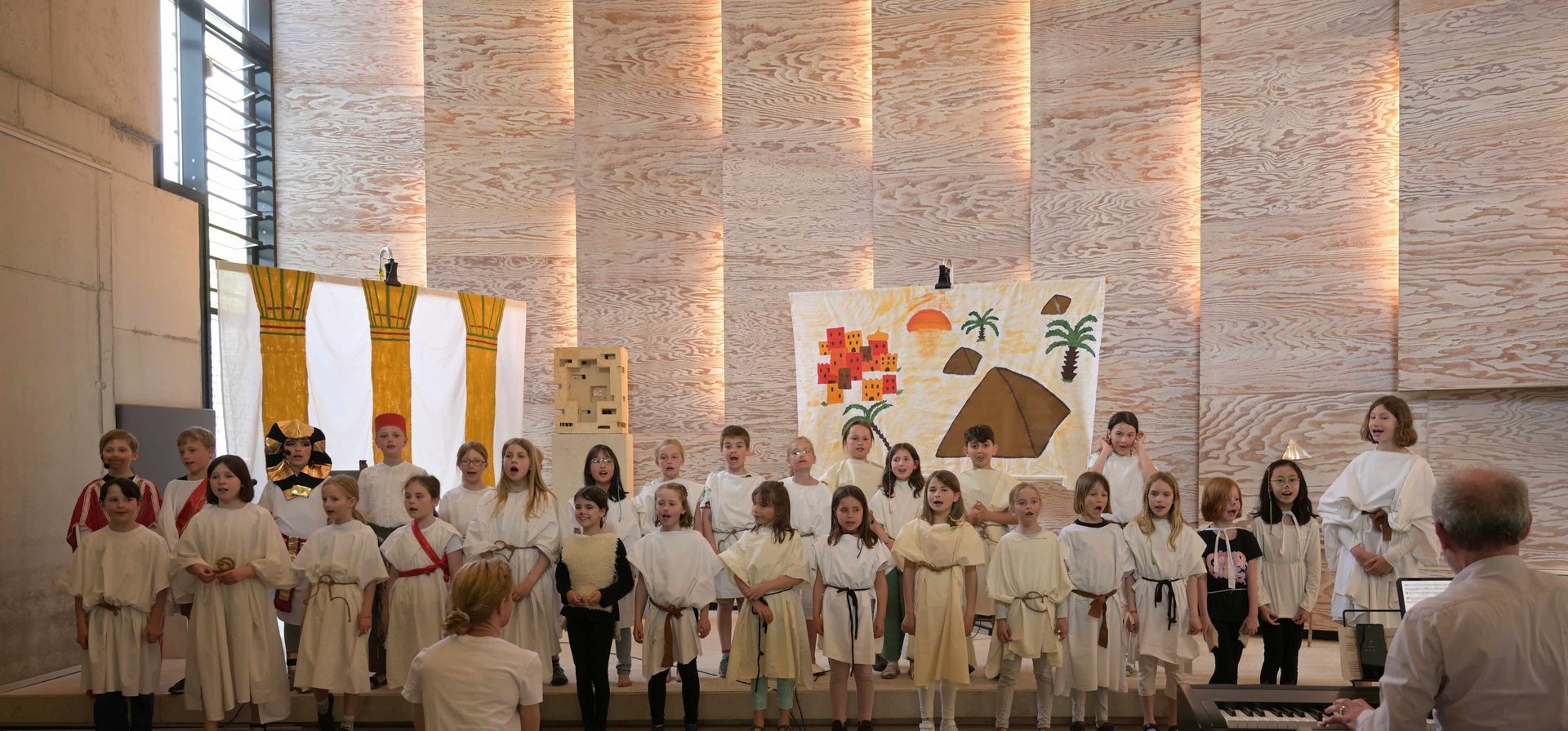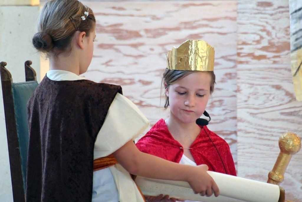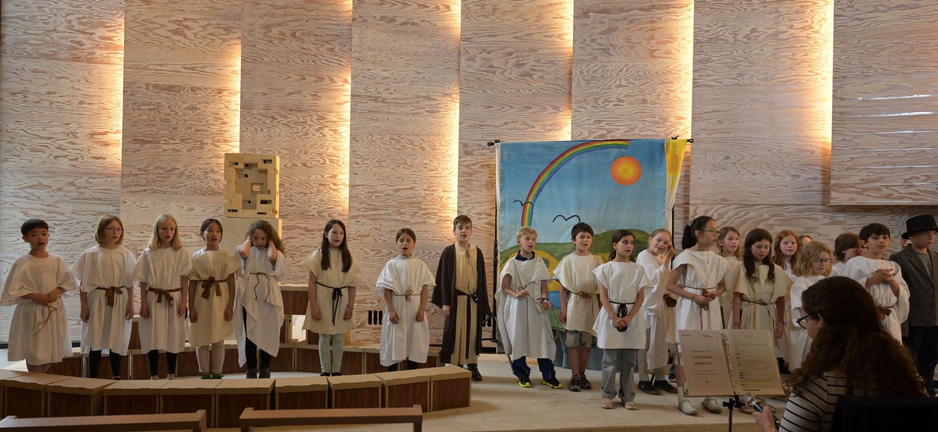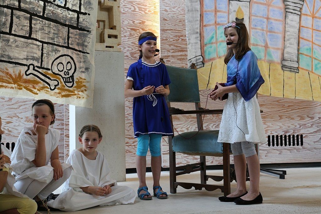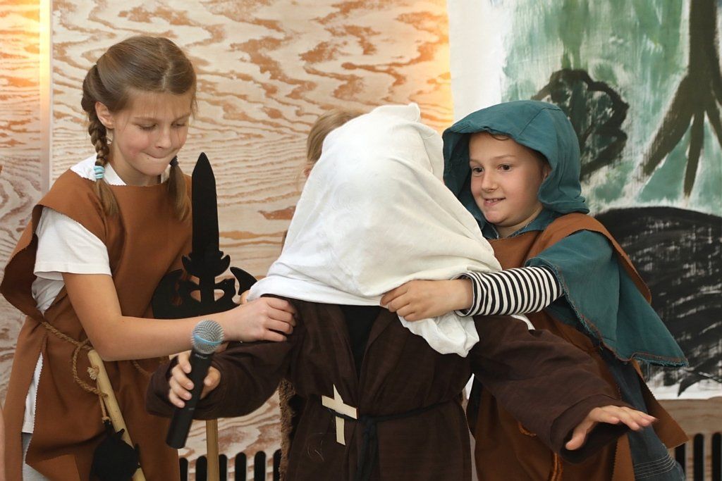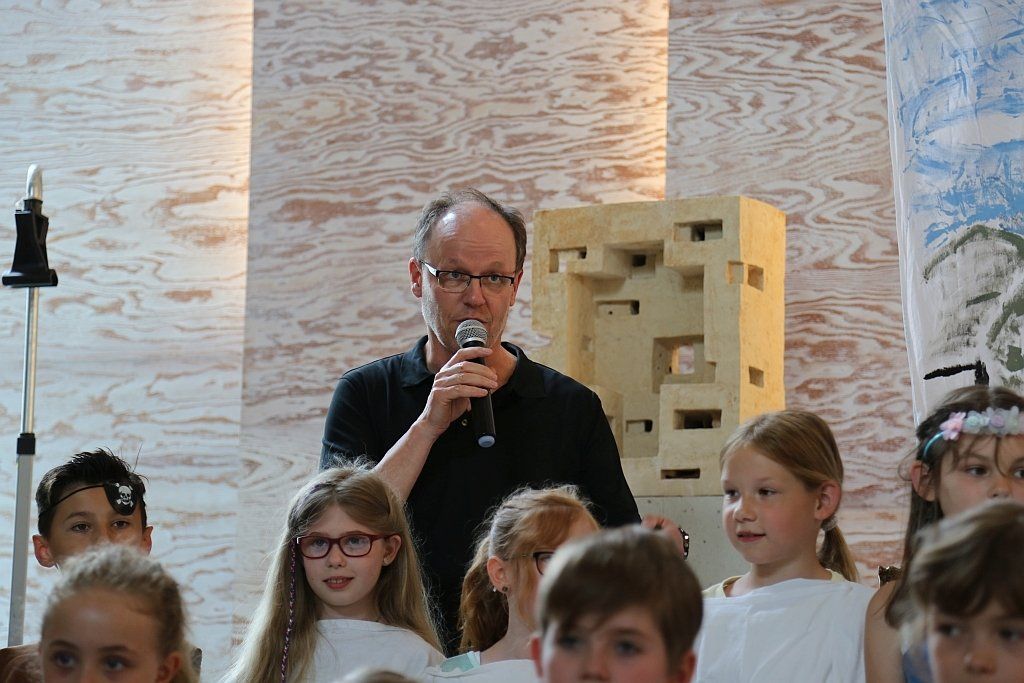 Die aktuell 30 Kinder unter der Leitung von Kantor Thomas Wegst sangen und spielten die Erzählung. Bühnenbilder und Kostüme wurden wieder von den Eltern mitgestaltet.