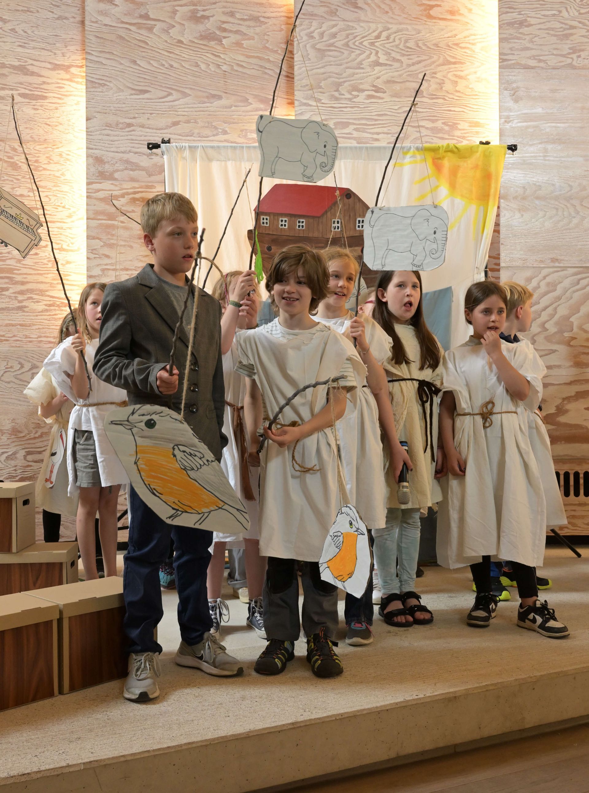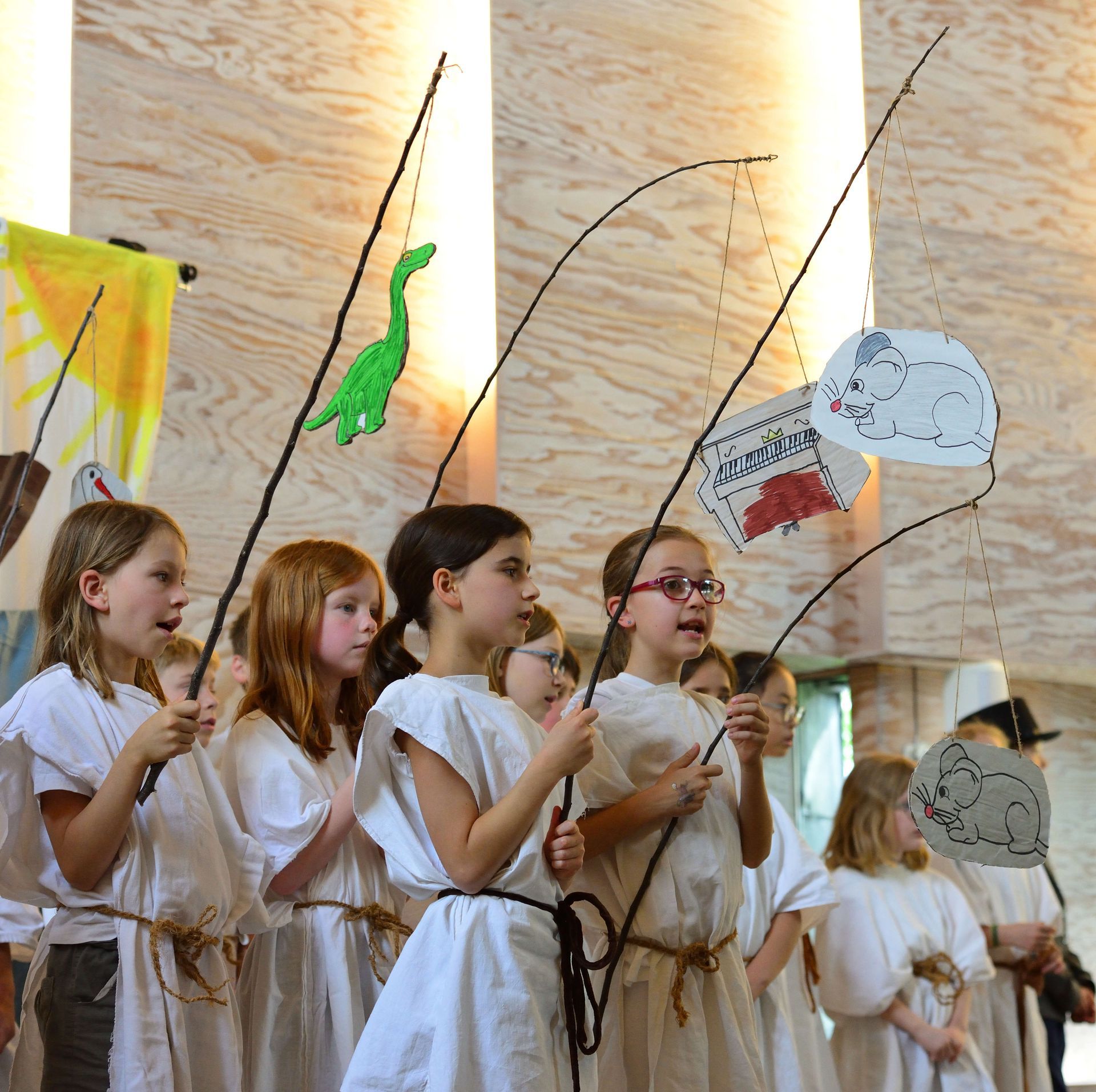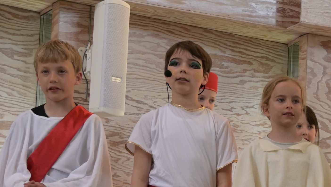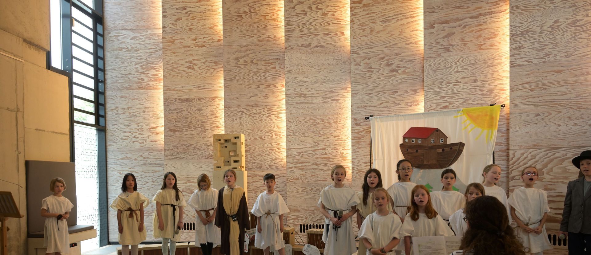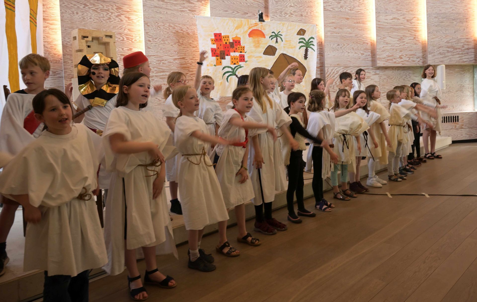 Die aktuell 30 Kinder unter der Leitung von Kantor Thomas Wegst sangen und spielten die Erzählung. Bühnenbilder und Kostüme wurden wieder von den Eltern mitgestaltet.