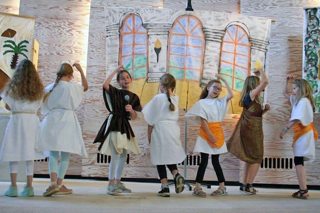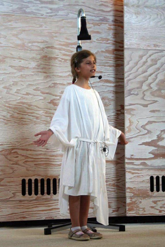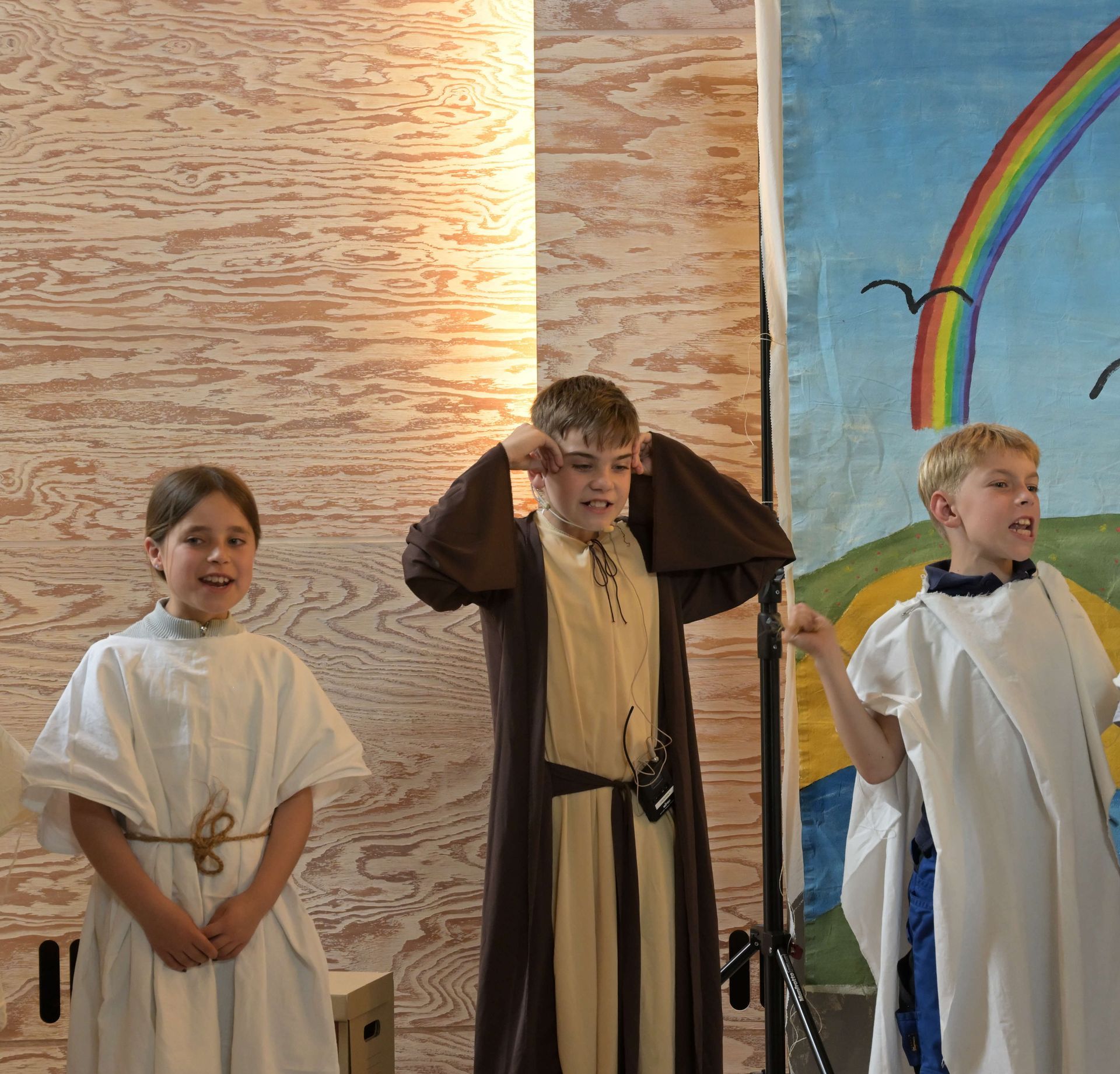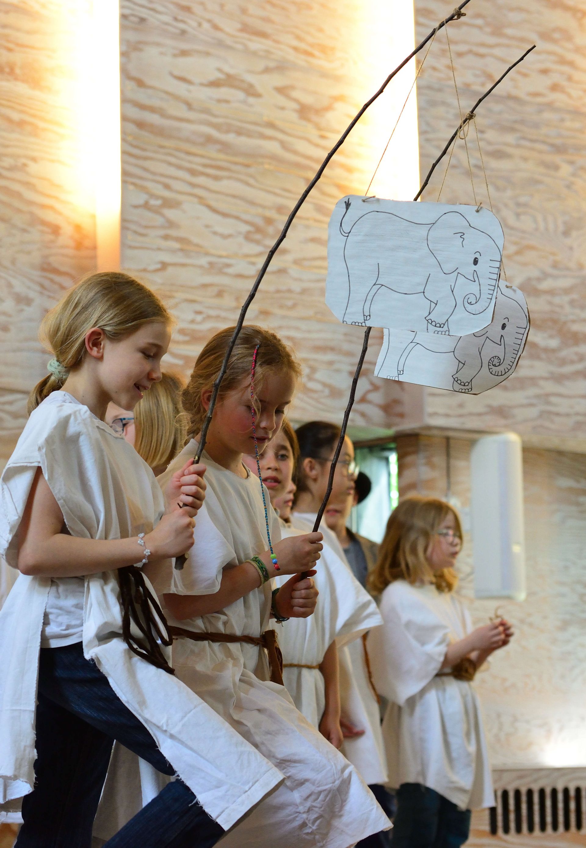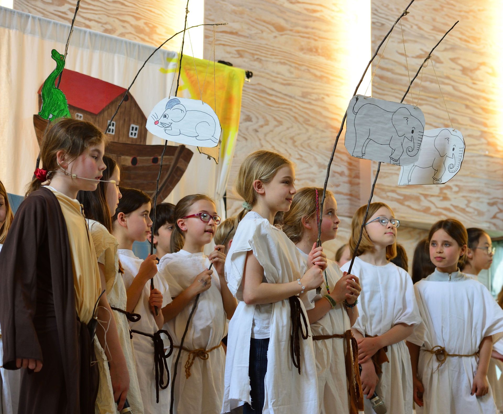 Die aktuell 30 Kinder unter der Leitung von Kantor Thomas Wegst sangen und spielten die Erzählung. Bühnenbilder und Kostüme wurden wieder von den Eltern mitgestaltet.