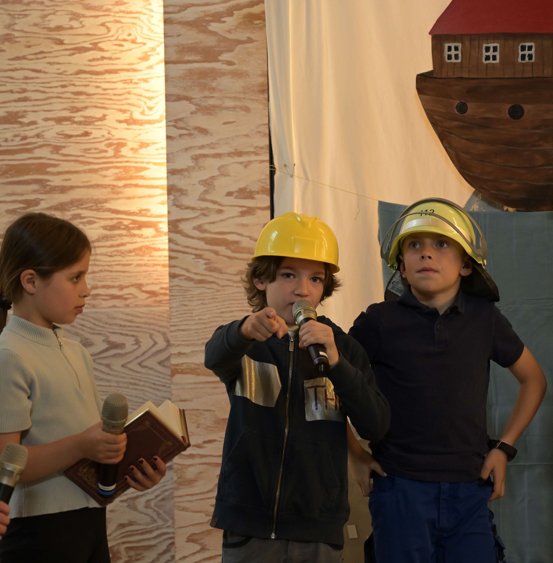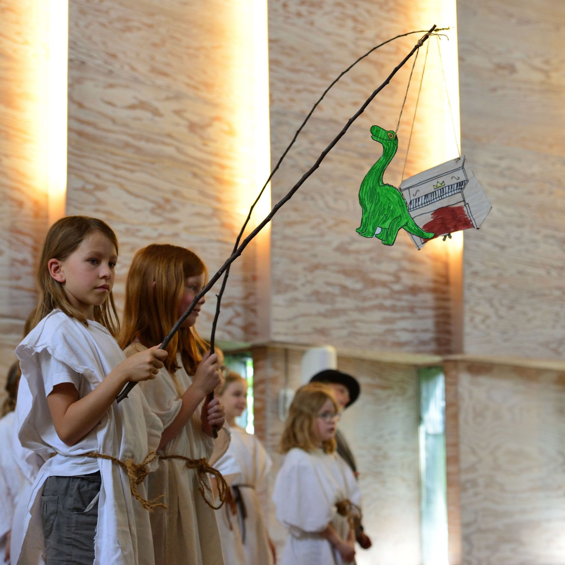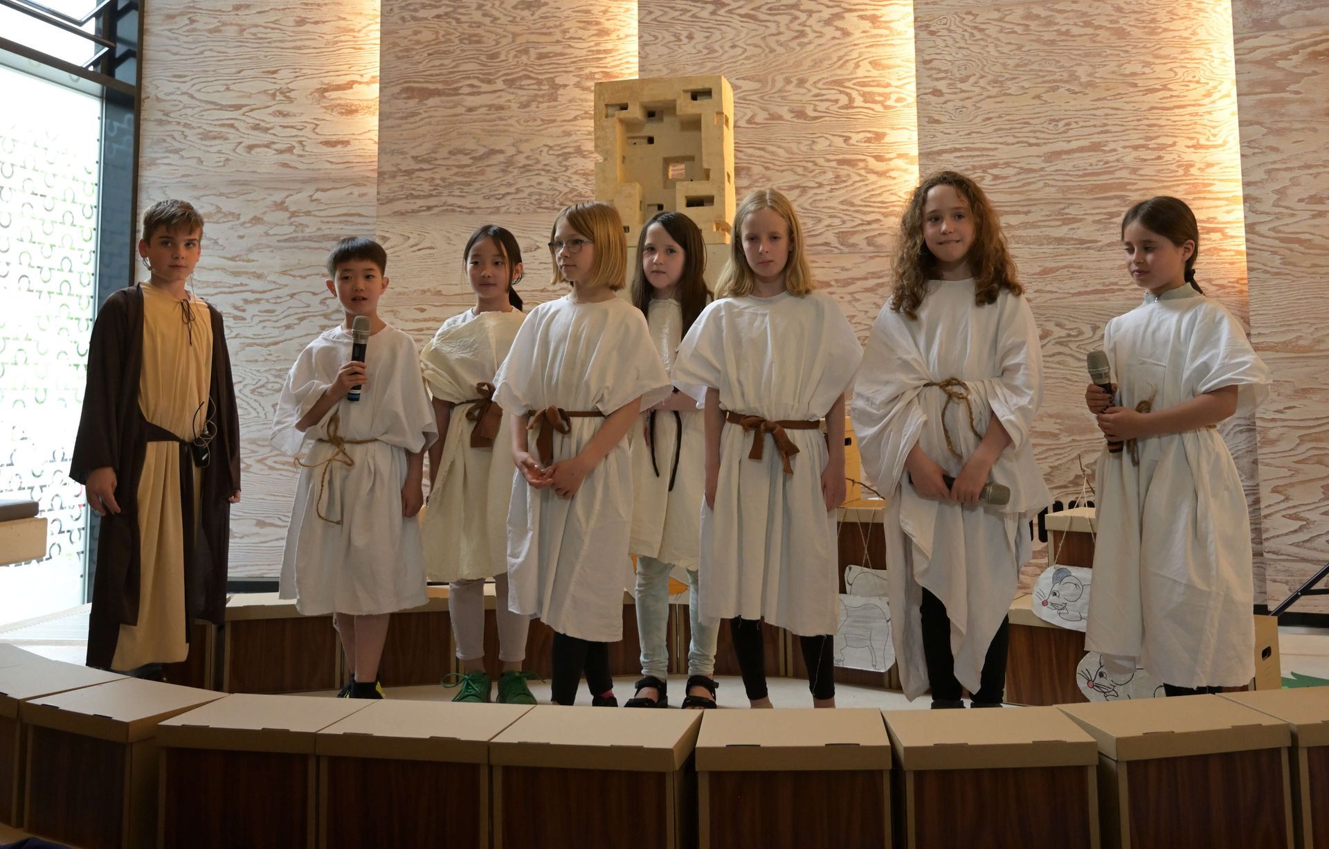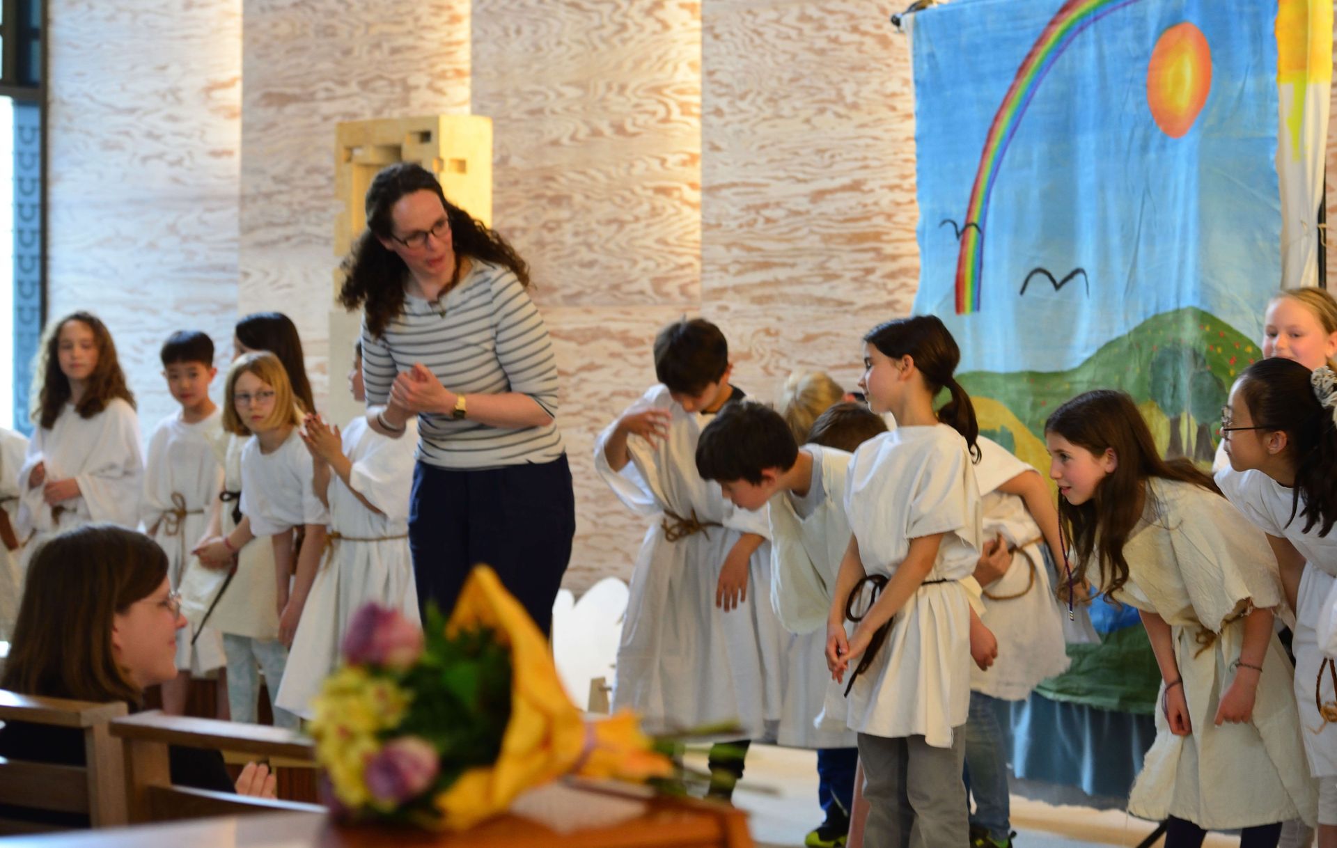 Die aktuell 30 Kinder unter der Leitung von Kantor Thomas Wegst sangen und spielten die Erzählung. Bühnenbilder und Kostüme wurden wieder von den Eltern mitgestaltet.